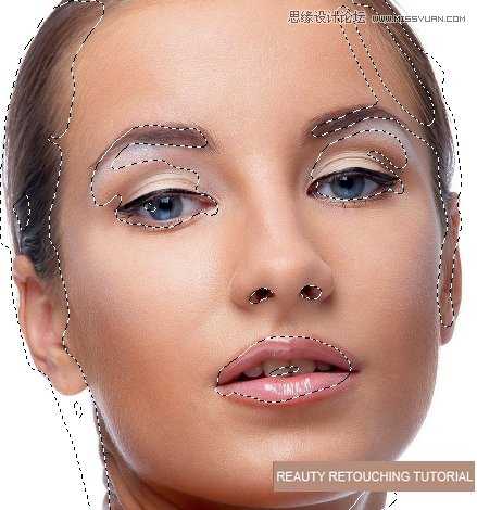 第八步:在这一步我们需要营造一些高光效果。新建一个图层,使用较软的白色画笔工具在脸上T形区域(额头、眼睛、鼻子下方、下巴)涂抹,如下图所示。要注意我是用不同的不透明度为脸上不同部位进行涂抹,因为这样才会出效果。
