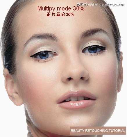 第十步:绘制阴影效果。同理,新建图层,设定硬度较软的画笔,颜色#c7bdb9,笔刷沿额头脸颊边缘涂抹并将模式更改为正片叠底30%。