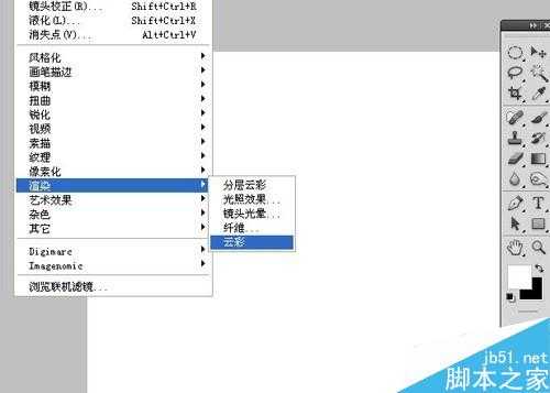 设置前景色/背景色为默认白色/黑色,点击滤镜—渲染—云彩,做出如图效果: