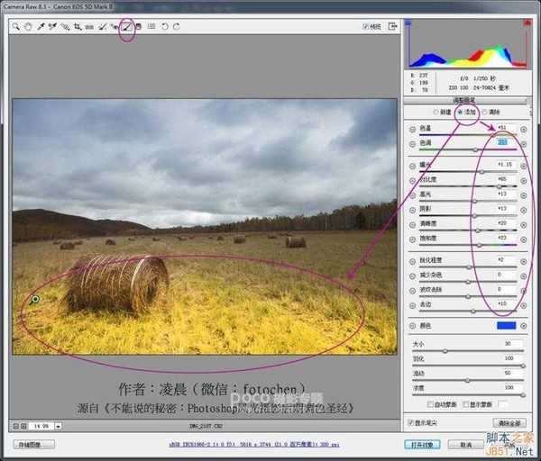 (5)用画笔在你需要创建区域高光的地方涂抹,然后在面版右边调整色温、色调等参数,明显看到,大幅度往右移动色温和色调数值,增加对比度和饱和度,这样草垛周边就很明显的建立一个高光金黄色调区域光效果,这个区域就是画笔建立的蒙版区域,区域之外的图像没有任何变化。