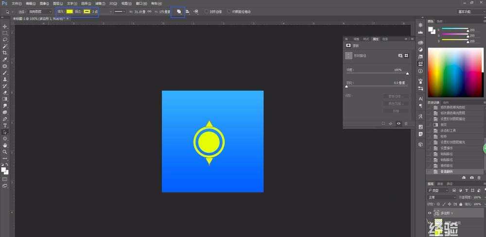 3、ctrl+j复制图层,ctrl+t自由变换,shift+alt等比缩放,去掉填充,描边2黄色