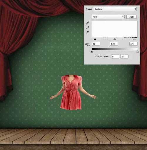 12、再次打开木板素材,如下图选择一段,并粘贴到主画布中。复制应用地板图层的图层样式,添加色阶调整图层,参数设置如下图。添加新图层,选择渐变工具, 从素材顶端到中部添加黑色到透明的渐变。然后将关于地板的图层放到同一图层组中,命名为地板。