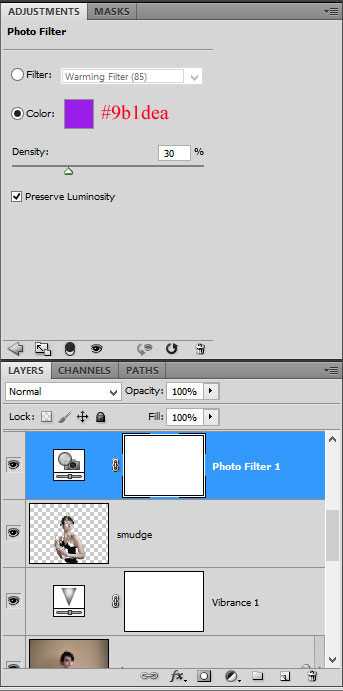 接下来,创建照片滤镜调整层。 使用颜色# 9b1dea设置其浓度为30%。