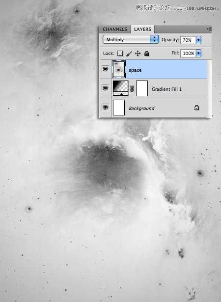 置入星空背景素材,调整至文档大小,并“图像>调整>去色”