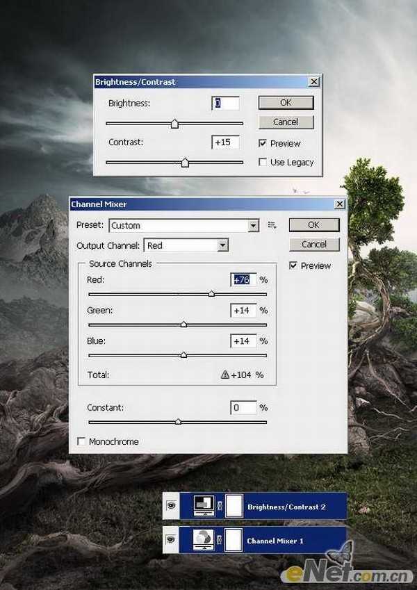 8.下面给整个画面来做一下调整。首先调出“亮度/对比度”如下调整,然后在调出“通道混合器”如下图调整