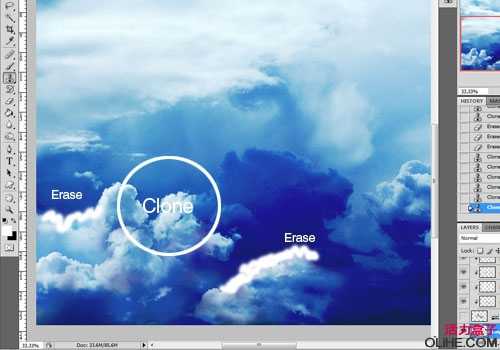 现在,克隆你认为需要多一些云彩地方。 使用一个约150像素宽的柔软的圆形笔刷,轻轻抹去所有可能看起来不符合图像整体效果的高光部分。