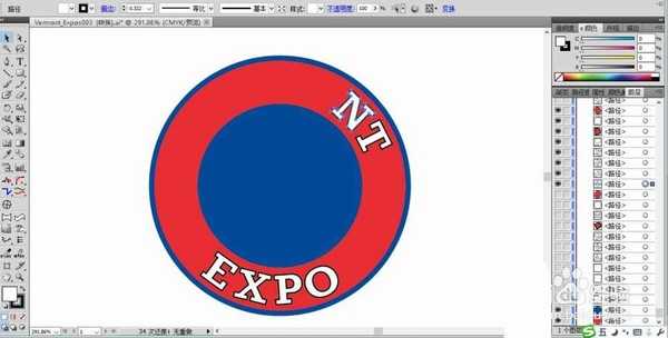 2、继续画出一个小的圆形在红色的圆形当中,我们进行中心对称,填充小的正圆形为蓝色。在两个圆形的之间,我们使用文字工具打出所需要的文字内容,让文字绕着圆形扩充,填充文字为白色,用黑色描边。