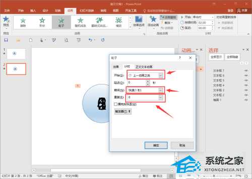 第三步,我们来设置一下动画,先给正圆设置,参数设置为,开始在上一个动画之后,期间为一秒,重复6次,然后点击确定即可。