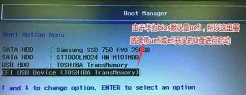 4、以上操作完成后,我们接着按键盘上的 F10 保存设置,然后将使用u启动制作好的U 盘启动盘(一定要记得必须要支持uefi启动的U盘)接到电脑上按 F12,接着我们 会看到启动菜单,我们选择带 uefi 或 efi 开头的 U 盘“回车”启动。如图所示: